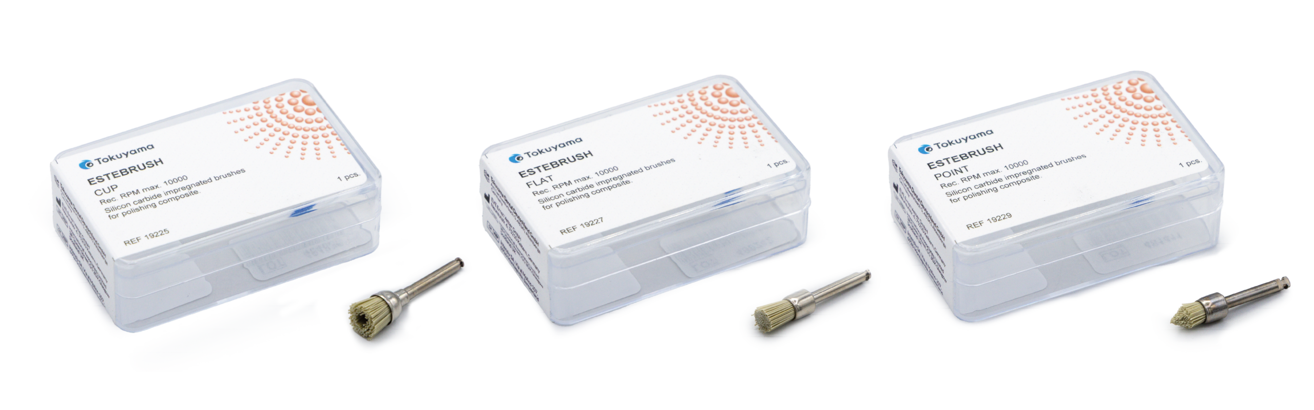 Gli Estebrush Tokuyama sono spazzole flessibili sviluppate specificamente per la lucidatura a specchio di otturazioni in composito occlusali, senza necessità di paste lucidanti aggiuntive.